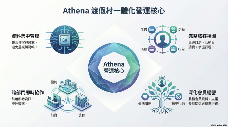 Athena以「一體化營運平台」為核心設計理念,協助渡假村將複雜的營運流程,化為清楚、可控、可擴充的管理架構。