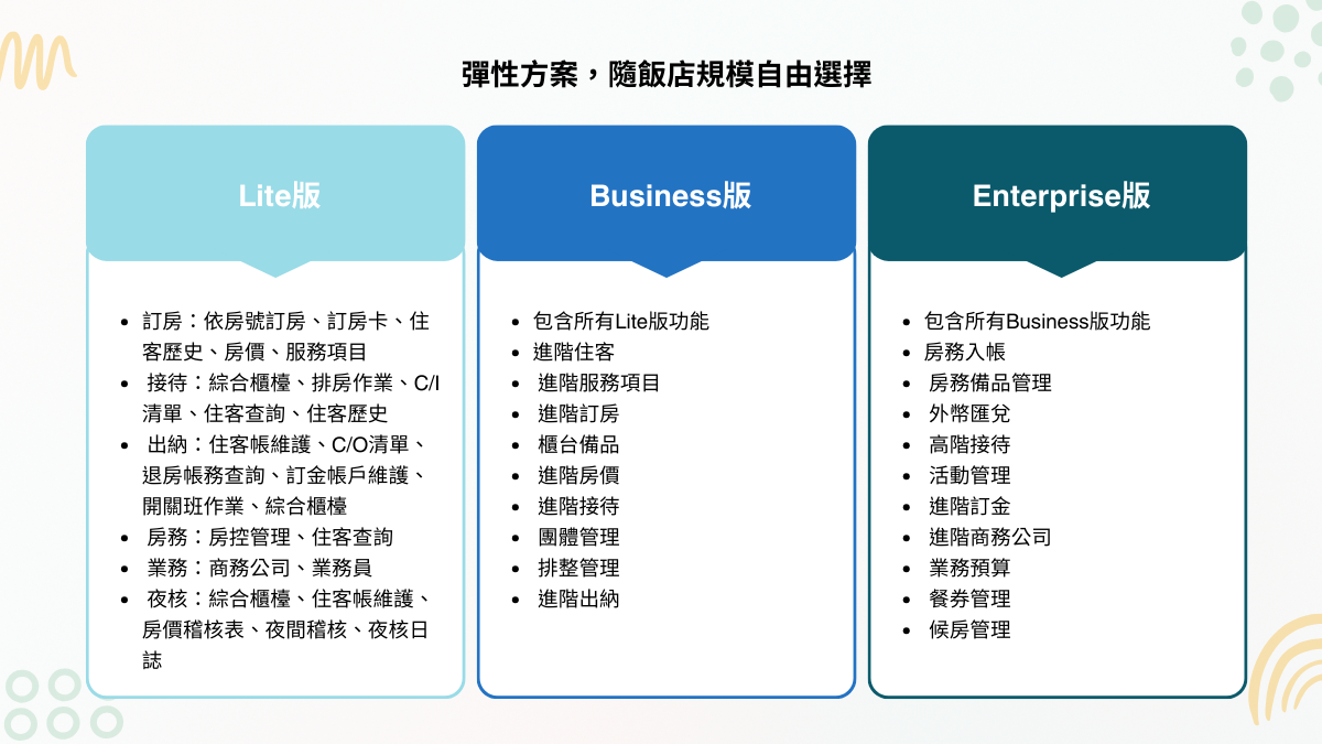 - 模組化功能設計:依飯店規模與營運需求,自由增減系統模組,降低導入與擴充成本。