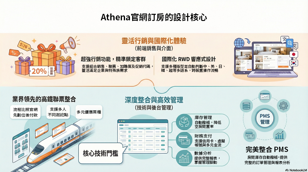 Athena Booking Engine 以 「行銷彈性 × 系統整合 × 使用體驗」 為核心設計理念,協助飯店打造一套能賣房、能經營會員、也能降低現場負擔的一站式官網訂房解決方案。不只是接訂單,而是讓官網成為可持續成長的直訂通路。