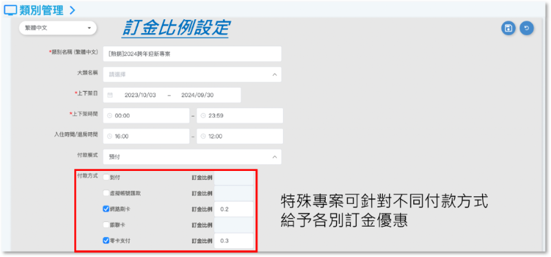 - 彈性訂金設定: 符合觀光局定型化契約,可針對不同付款方式給予各別訂金優惠